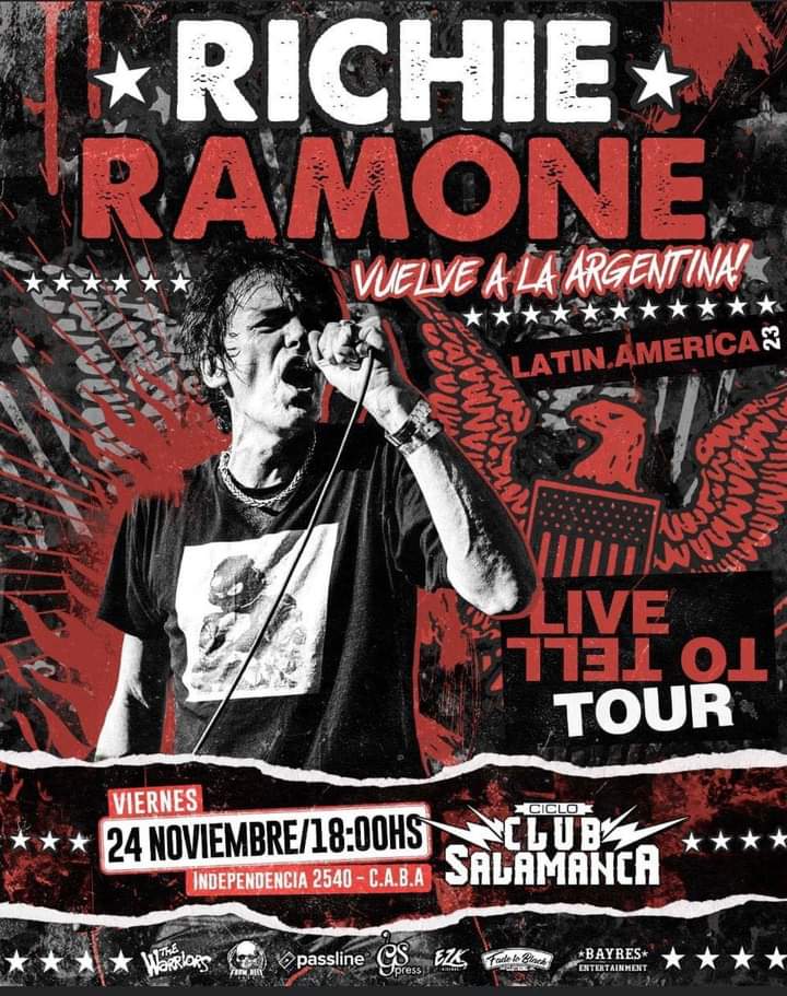 El ex baterista de la legendaria banda de punk rock The Ramones Richie Ramone regresará a la Argentina el próximo viernes 24 de noviembre de 2023 en el Centro Salamanca, Avenida Independencia 2540 C.A.B.A. a partir de las 19:00 hs en el marco del «Latin American 2023 Live To Tell Tour».