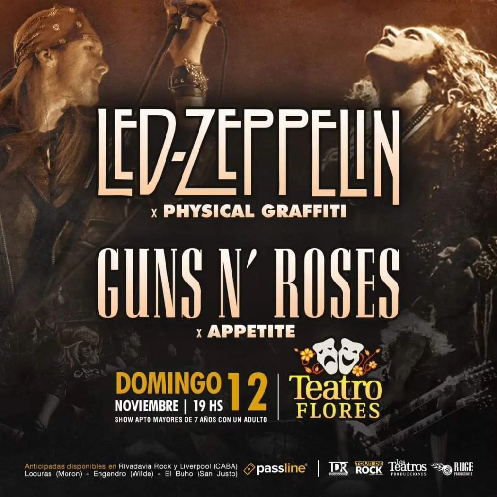 Physical Graffiti Tributo a Led Zeppelin y Appetite Tributo a Guns N Roses se presentaron el pasado domingo 12 de noviembre de 2023 en El Teatro de Flores, Avenida Rivadavia 7805 C.A.B.A. Las puertas fueron abiertas a las 19:00 hs.