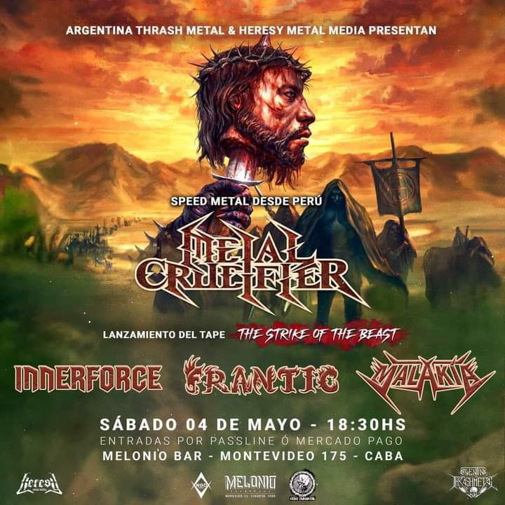 La banda de speed metal originaria de Perú Metal Crucifier vendrá a la Argentina para presentar el Protape de su segundo disco «The Strike of the Beast» lanzado por ARGENTINA THRASH METAL. Esto sucederá el próximo 4 de mayo de 2024 en Melonio Bar, Montevideo 175 C.A.B.A. a partir de las 18:30 hs y junto a ellos se presentarán Innerforce, Frantic y Malakia.