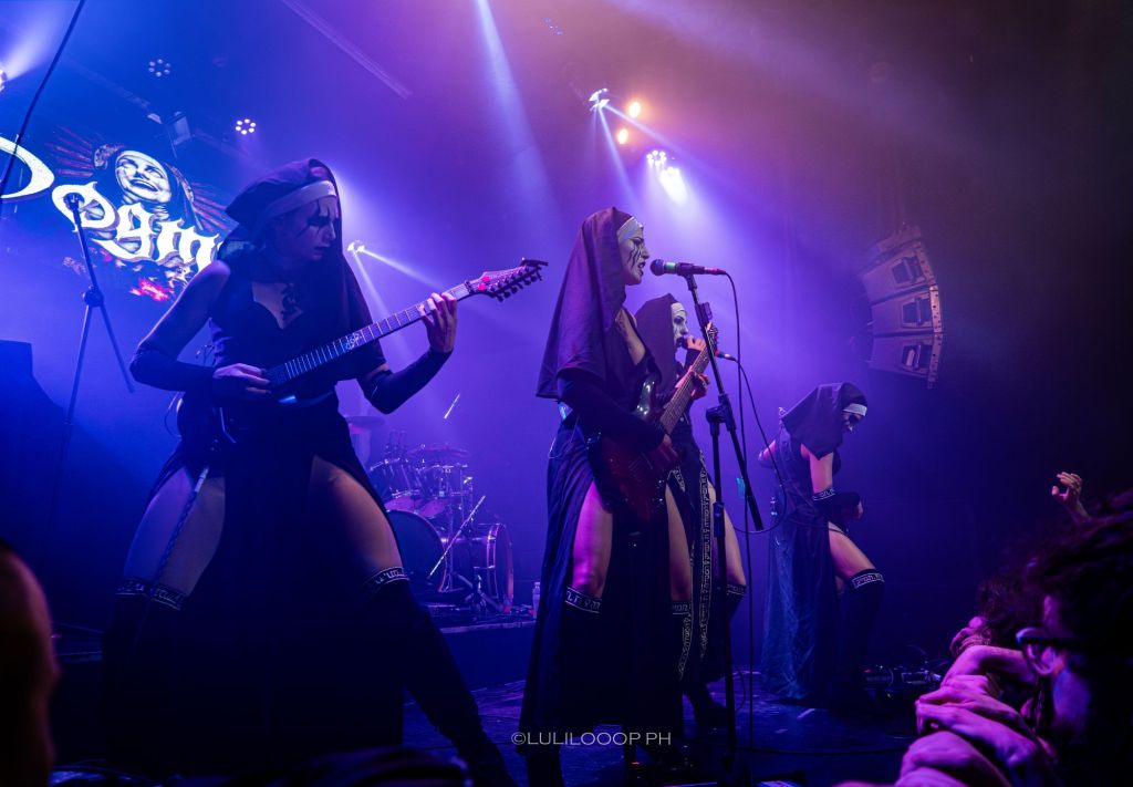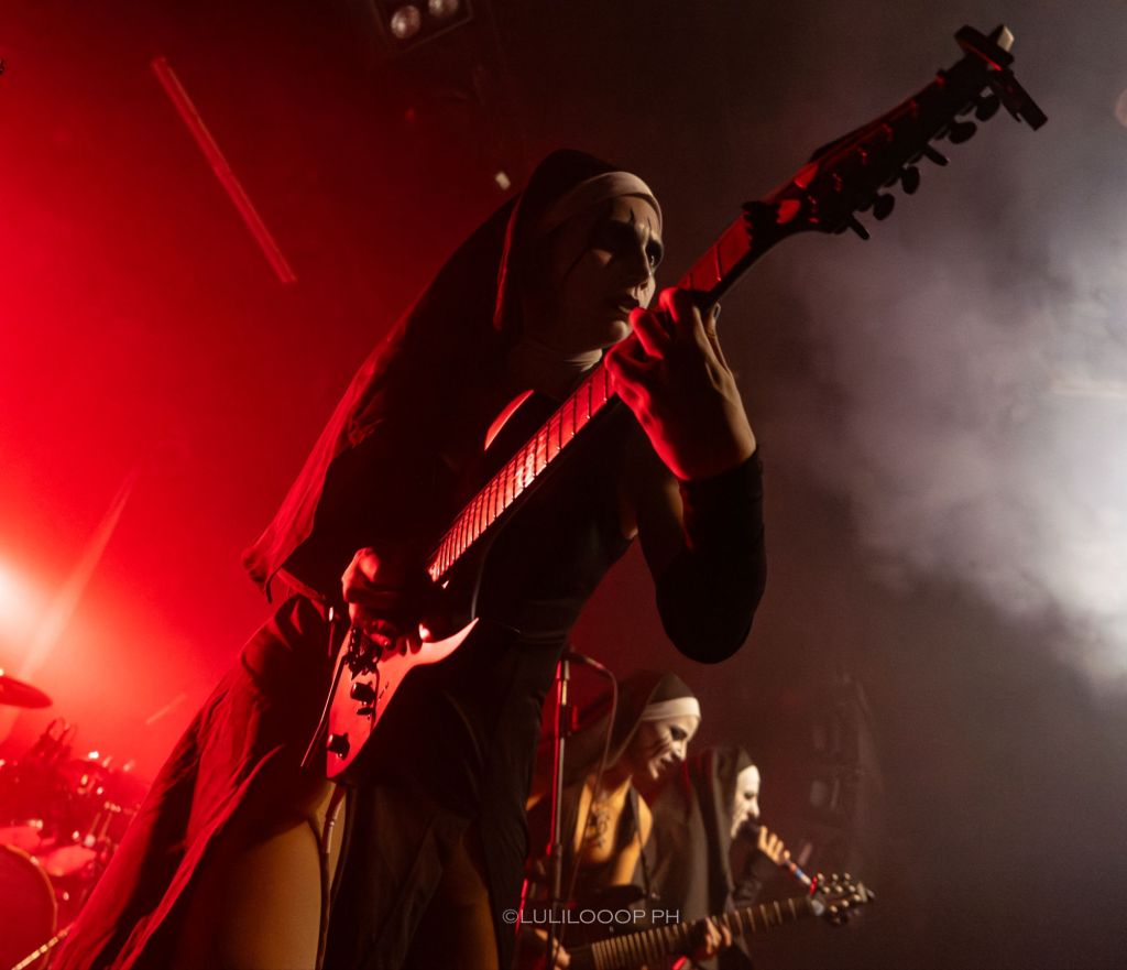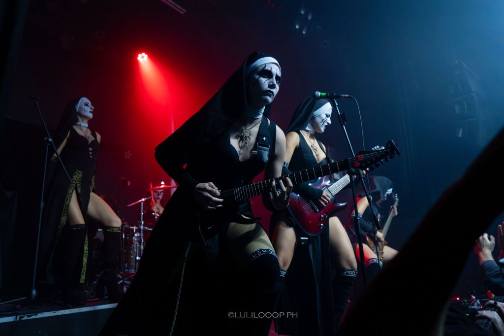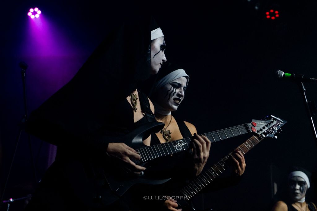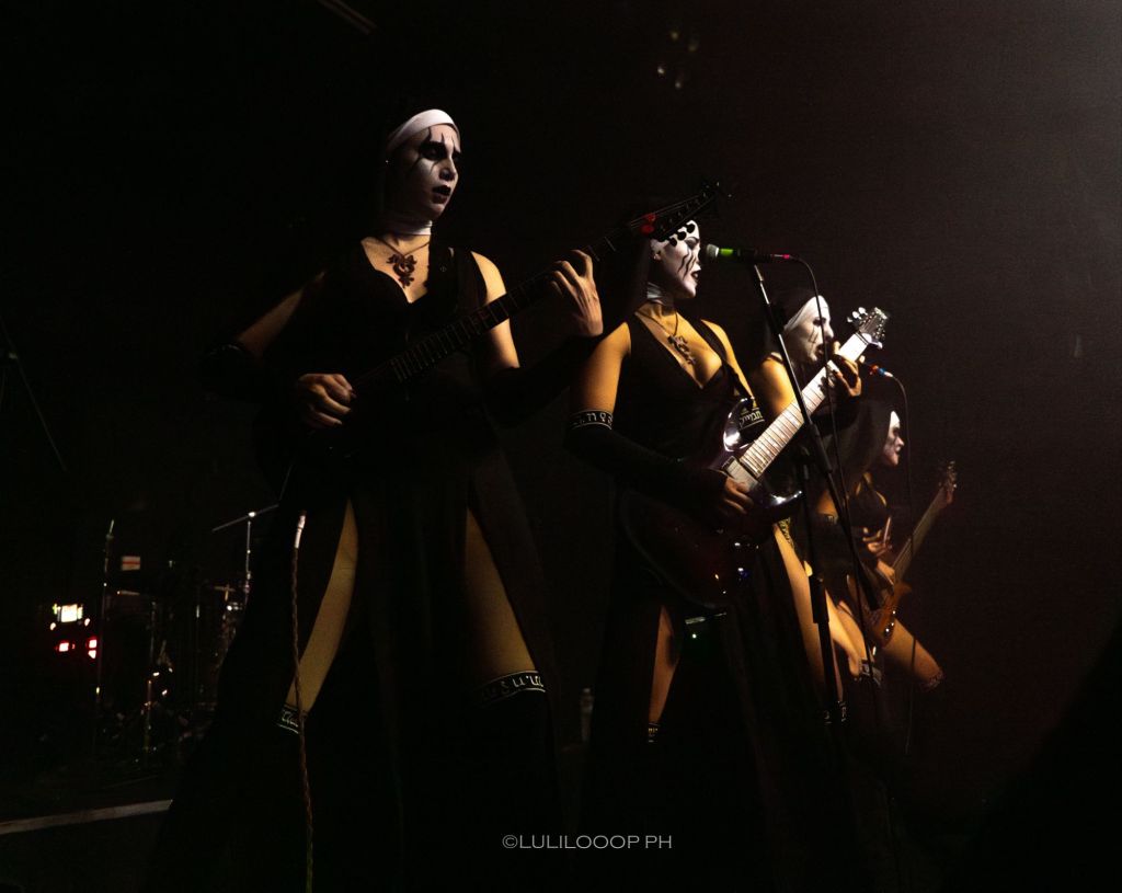 Pasados veinte minutos de las ocho, bajo una introducción pongamosle «Celestial», y las luces tenues, aparecieron ellas con atuendos de monjas y sus rostros pintados con lágrimas negras. El estallido del público fué total. Ellas nos vinieron a deleitar con su primer trabajo discográfico que lleva el mismo nombre que la banda. Desde el vamos la energía que desplegaron en el escenario fué total, dientes apretados, guitarra y bajo en mano, te hacían pensar que estaban dispuestas a ir a una guerra. También quiero destacar sus facetas teatrales y sensuales de ellas que cautivaron a los presentes y se ganaron el corazón de todos. Cada riff liberado al público, tuvo un gran impacto en la monada que enloquecida saltaron y se atrevieron a entonar, cánticos de cancha con el nombre de la banda como ser «ohhh soy de Dogma…». Y para que la fiesta fuese completa en su totalidad, hicieron un popurri instrumental donde incluyeron «Walk», «The Trooper», «Master of Puppets», «Simphony of Destruction» entre otros. Ahí sí se puede decir que la gente enloqueció en su totalidad y se empujaron unos a otros felices y contentos. El final del show llegó de la mano de «Father I Have Sinned» pasados cinco minutos de las nueve de la noche.