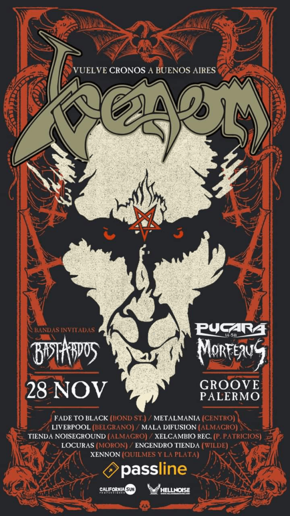 El legendario grupo británico Venom, pionero del Black Metal, vuelve a nuestro país tras siete años de ausencia. En esta oportunidad, se presentarán en Palermo Groove (Av. Santa Fe 438, CABA) el jueves 28 de noviembre de 2024. Los grupos invitados para dar inicio a este show serán Bastardos, Pucara y Morferus.