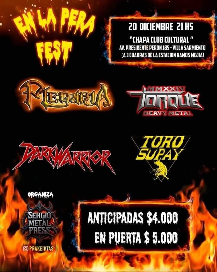 En la Pera Fest tendrá a poderosas bandas exponentes del Metal under argentino. Estás serán Plegaria Metal, Toro Supay, Torque Heavy Metal y Dark Warrior. Todas ellas son agrupaciones que ya tienen una trayectoria importante y prometen hacer honor al nombre de este show.