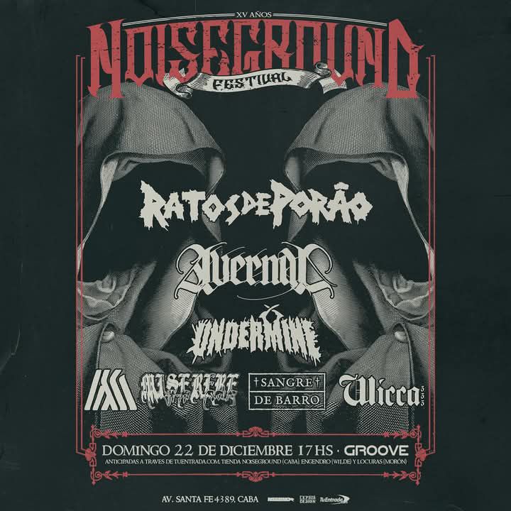 La banda de origen brasilera Ratos De Porão visitará una vez más la Argentina siendo cabeza de cartel del mítico Noiseground Festival que festeja sus 15 años de existencia. Pero como habíamos dicho anteriormente esto es un festival y por lo tanto, el line up definitivo está integrado por las siguientes bandas del ámbito local, Avernal, Undermine, IAH, Miserere, Sangre de Barro y Wicca. Esto acontecerá el próximo domingo 22 de diciembre de 2024 en Groove Avenida Santa Fé 4.389 C.A.B.A. a partir de las 17 hs.