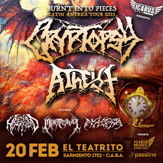 Estas bandas están en medio de su tour «Burnt into Pieces Latin American Tour 2025». El 19 de febrero se presentarán en la Sala Metrónomo de Santiago, Chile, junto al grupo nacional Overtoun. Al día siguiente, el 20 de febrero, actuarán en El Teatrito de Buenos Aires, Argentina, como mencionamos. El 22 de febrero, la gira los llevará al Boro Room en Bogotá, Colombia. Cryptopsy, formada en 1992 en Montreal, Canadá, es reconocida por su enfoque técnico y brutal en el Death Metal. Atheist, originaria de Florida, Estados Unidos, es pionera del Death Metal Técnico y Progresivo desde la década de 1980. Su álbum «Piece of Time» de 1990 es considerado una obra maestra del género. Esta gira ofrece una oportunidad única para los fanáticos del Metal Extremo en América Latina.
