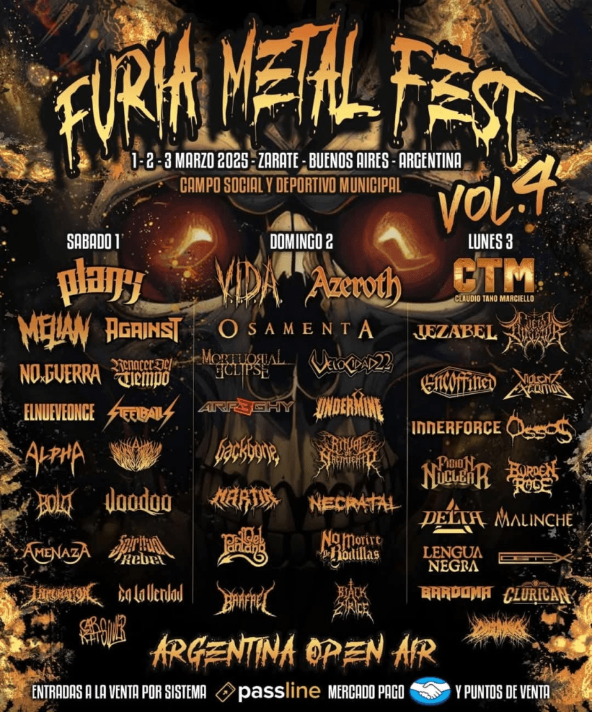 El Furia Metal Fest regresará con su cuarta edición del 1 al 3 de marzo de 2025 en Zárate, Buenos Aires. Este festival autogestionado ofrecerá tres días de puro Metal con más de 45 bandas repartidas en dos escenarios. La propuesta incluirá zona de acampe, espacios gastronómicos y actividades para los asistentes, convirtiéndose en una experiencia única para los amantes del género extremo. Las entradas están a la venta en Passline, con abonos por tres días, incluyendo acampe, por $60.000 y tickets diarios por $25.000.