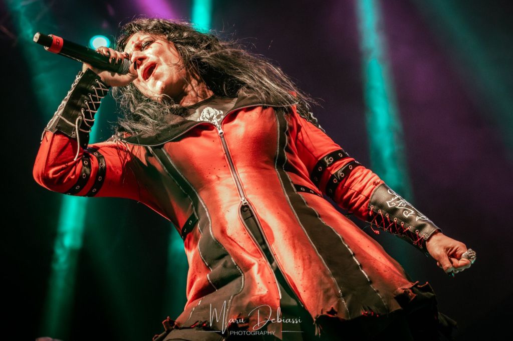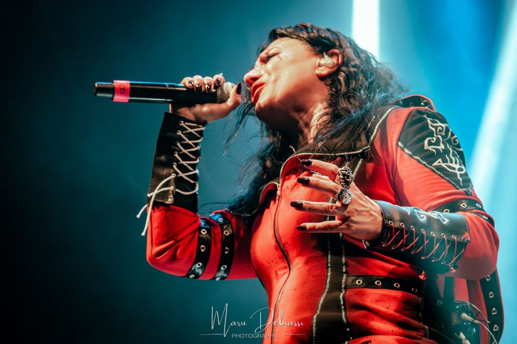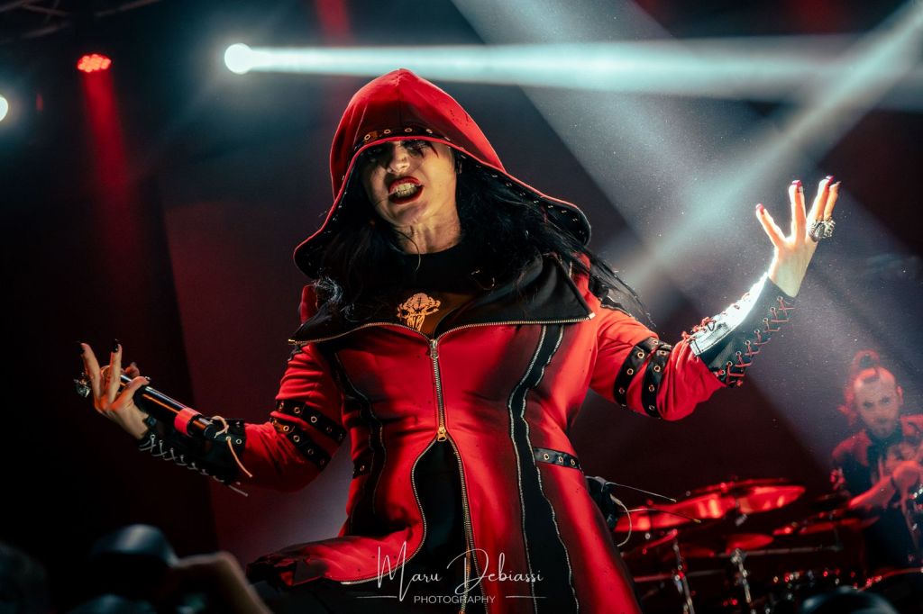 Cristina Scabbia irrumpió en escena con un imponente atuendo rojo con capucha, cautivando con su inconfundible voz. La banda presentó canciones de su nuevo álbum «Sleepless Empire», junto con clásicos de su discografía, en un espectáculo donde la teatralidad, la iluminación y el sonido crearon una atmósfera gótica única.